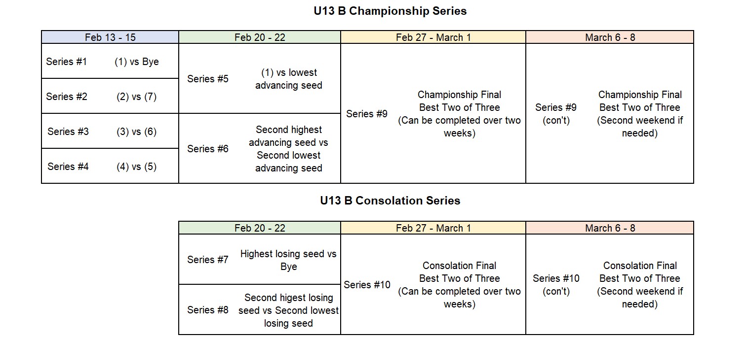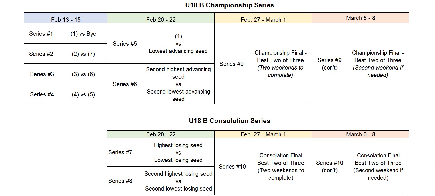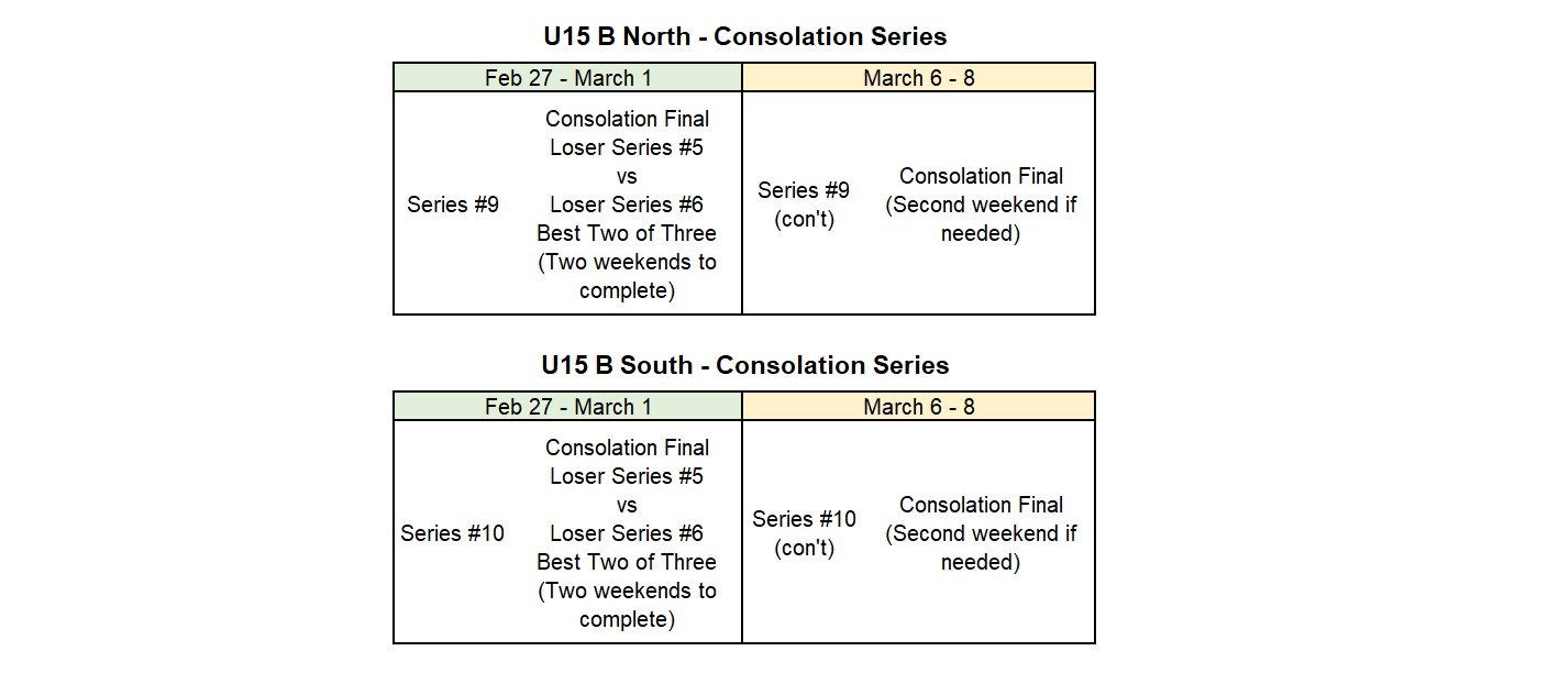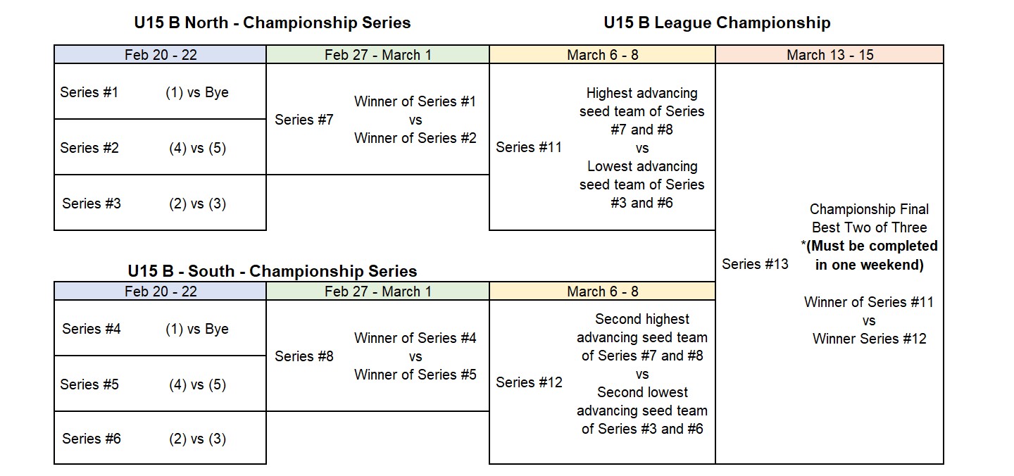The U15 B North and South Division Championships will be held after the completion of the U15 B Championships and before the U15 B Provincials. These series will need to be completed in one weekend and a banner will be awarded to each series winner.