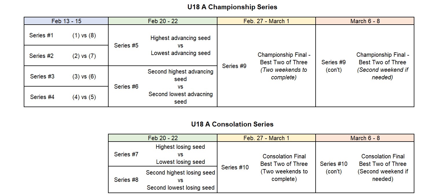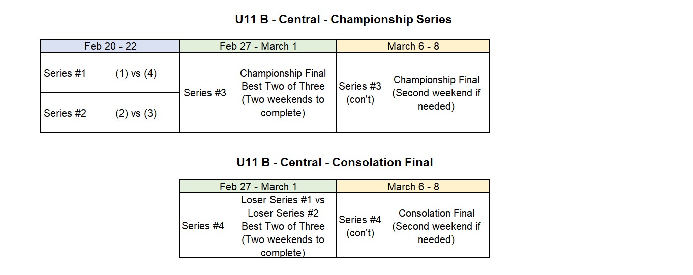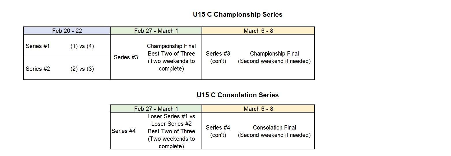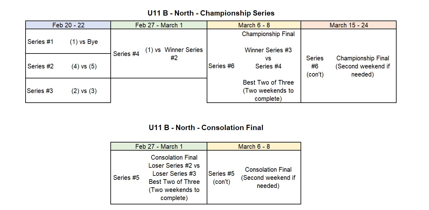 The U15 B North and South Division Championships will be held after the completion of the U15 B Championships and before the U15 B Provincials. These series will need to be completed in one weekend and a banner will be awarded to each series winner.